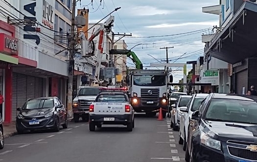 No dia 7 de fevereiro, as lojas na área da Rua Brasil fecharam mais cedo por falta de energia. Na foto, as equipes da Elektro durante a troca do transformador.