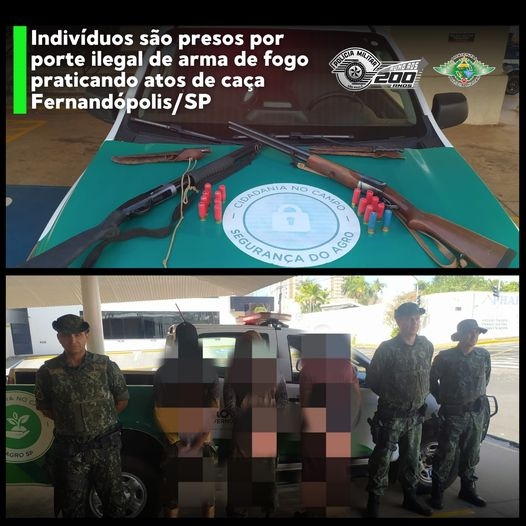 Policiais Militares Ambientais da Companhia de Fernandópolis, prenderam três homens praticando atos de caça, utilizando duas armas de fogo, que eram portadas sem autorização, na área rural do município de Fernandópolis.