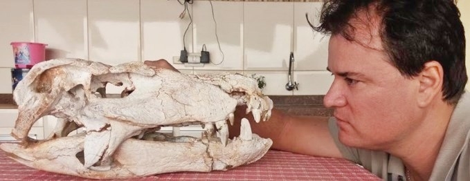 Professor Cadu com um crânio de crocodilo pré-histórico da coleção de fósseis que está sob sua guarda