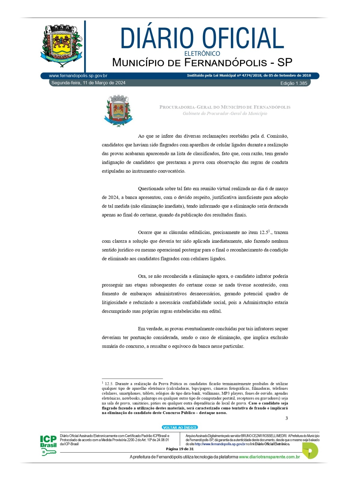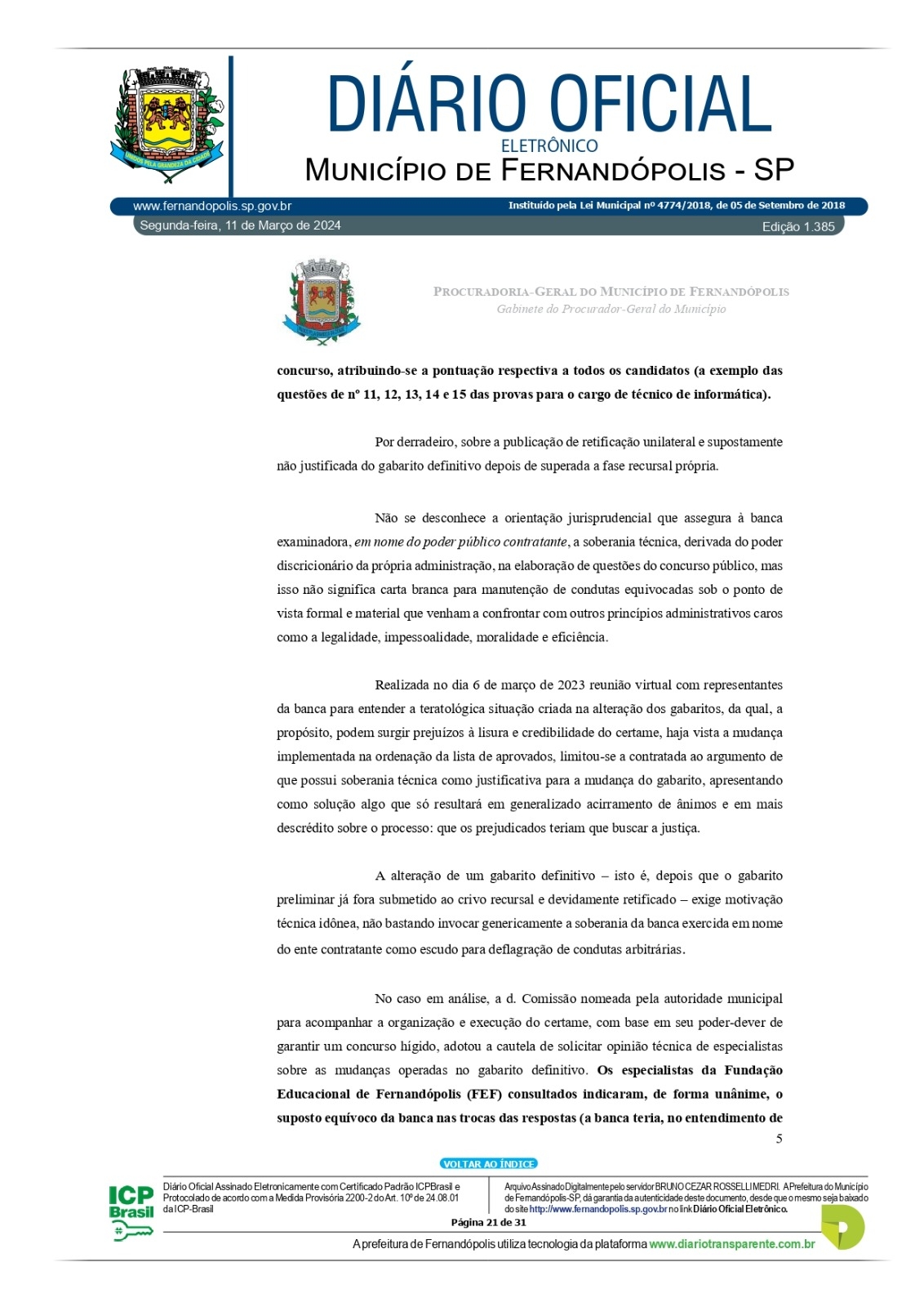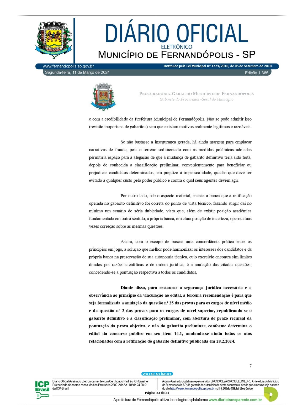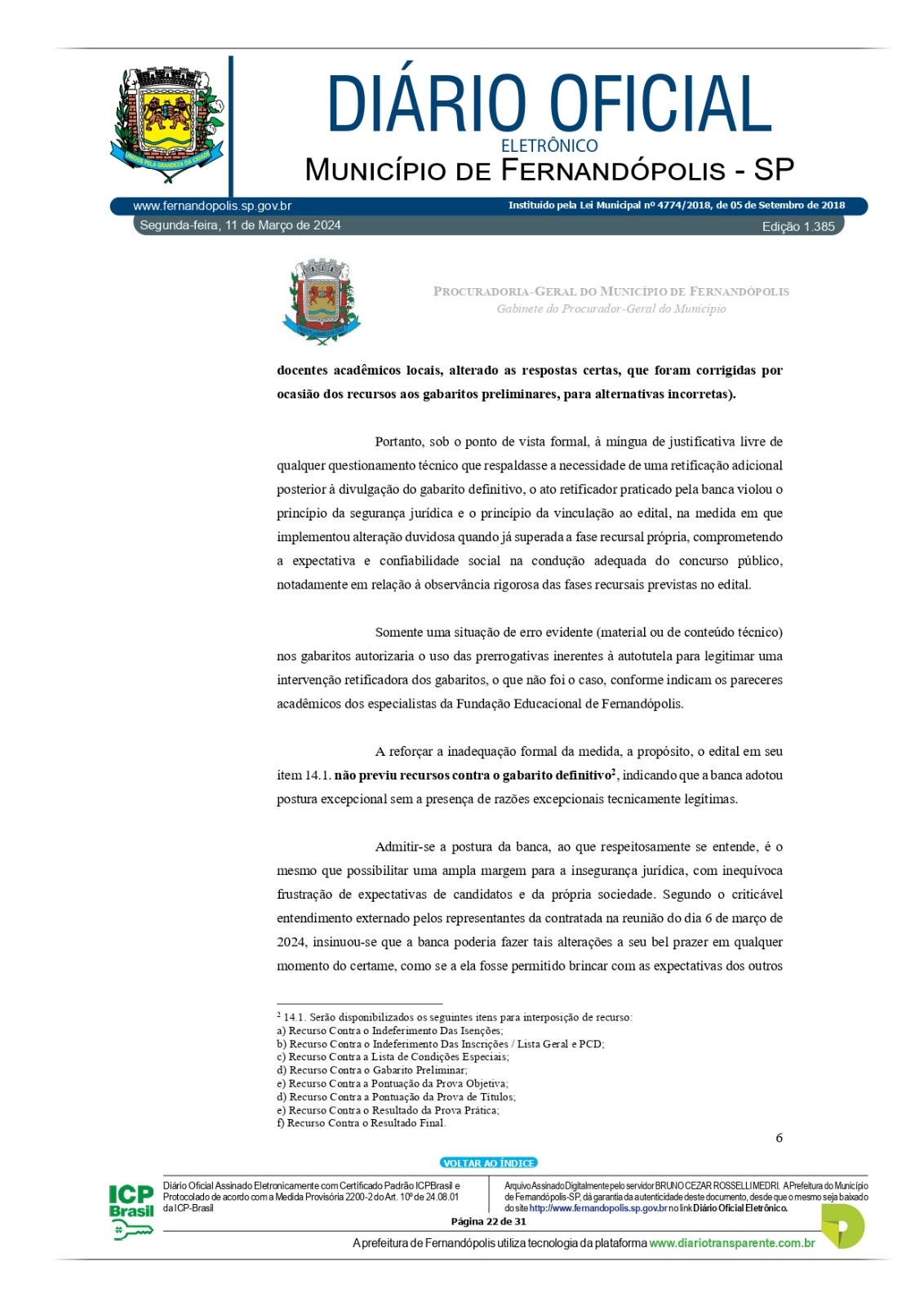 A PGM – Procuradoria Geral do Município – divulgou no início da tarde desta segunda-feira, 11, na edição do Diário Oficial Eletrônico do município, parecer com recomendações para salvar o concurso da prefeitura que foi suspenso no dia 1º de março por decisão do prefeito André Pessuto, após onda de denúncias que chegaram à prefeitura e Ministério Público.