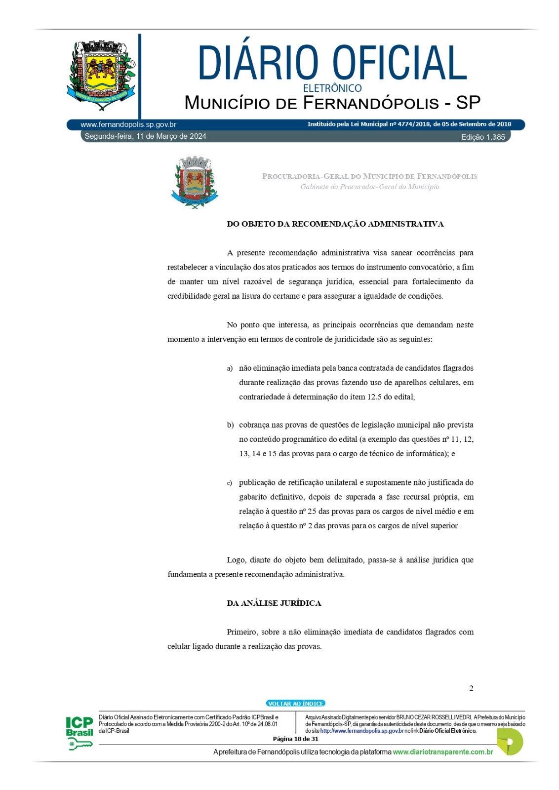 Na decisão, assinada pelo Procurador Geral do Município Gerson Januário Junior, a recomendação faz análise de todas as denúncias sobre o concurso e por fim apresenta uma série de recomendações para adoção de medidas saneadoras como condição para retomada do certame.