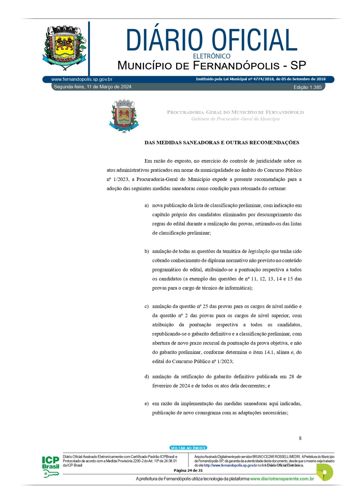 d) anulação da retificação do gabarito definitivo publicada em 28 de fevereiro de 2024 e de todos os atos dela decorrentes; e