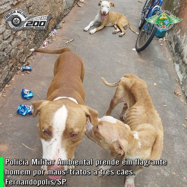 Segundo a denúncia, havia na casa três cães da raça Pitbull passando fome além de viverem em um quintal repleto de fezes, lixo e com o mato alto. Questionado a respeito da alimentação dos animais, o rapaz afirmou que comem ração, entretanto, que estavam há 15 dias sem alimentação por falta de dinheiro.