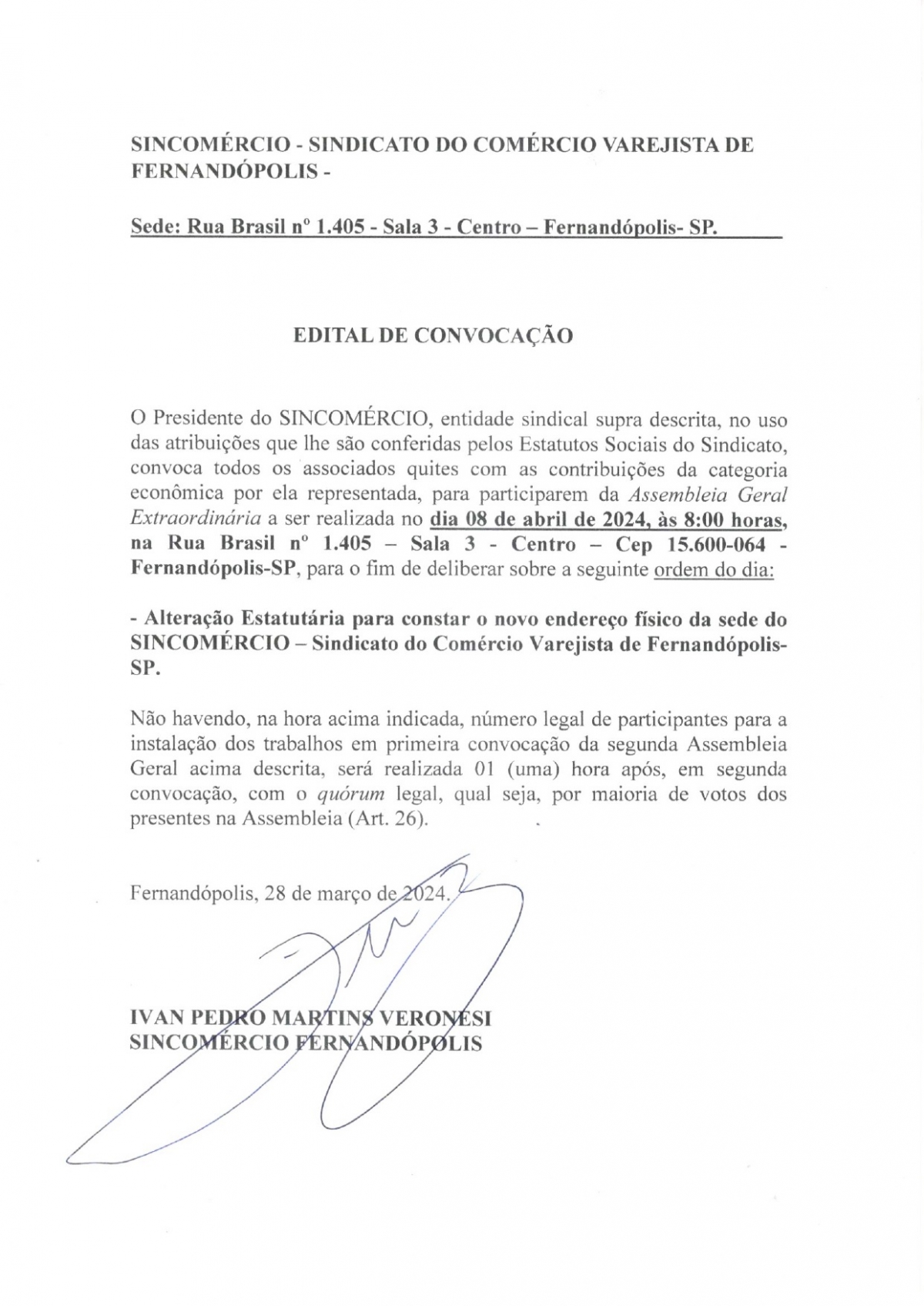 SINCOMÉRCIO FERNANDÓPOLIS - EDITAL DE CONVOCAÇÃO