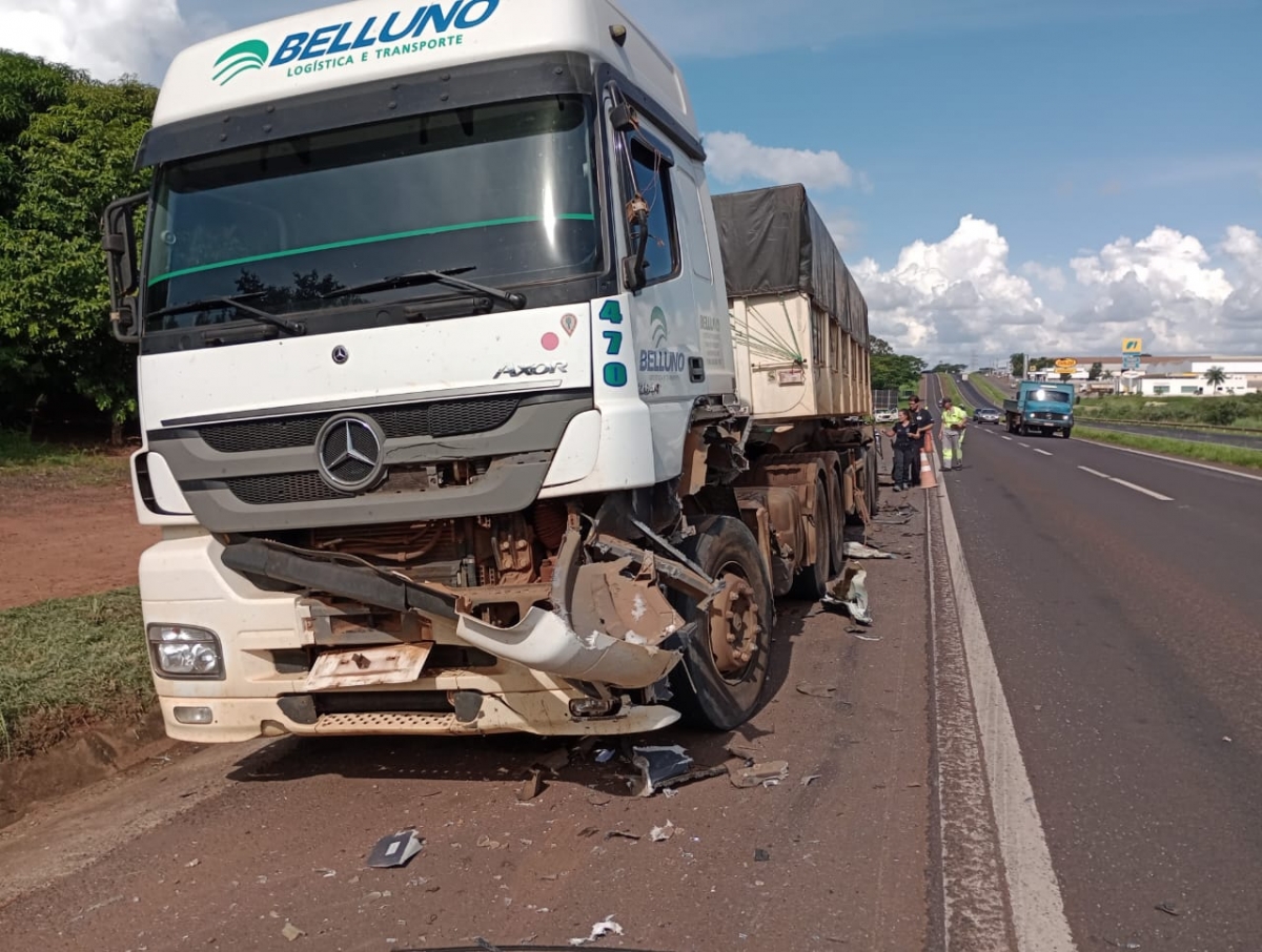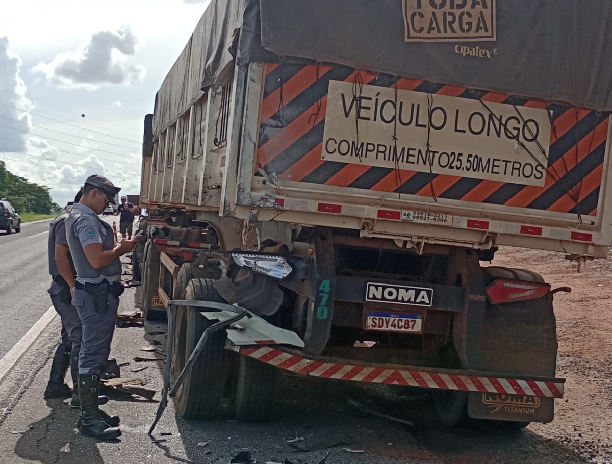 Carreta onde o ônibus bateu estava parada no acostamento.