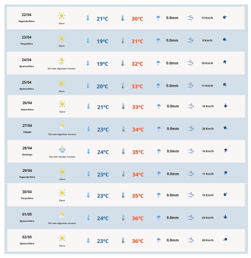 Mato Grosso, Mato Grosso do Sul, São Paulo, Goiás e parte de Minas Gerais devem registrar maior calor. De acordo com a Metsul, em Fernandópolis, a temperatura máxima começa a subir a partir desta terça-feira de forma progressiva, começando com 30° e já chegando a 34° no sábado, 35° no domingo e 36° no feriado de 1º de maio. Não há previsão de chuva no período.
