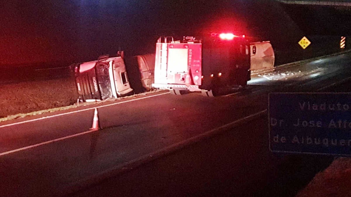 A carreta bitrem, da Usina Cofco, tombou no canteiro central da rodovia por volta das 4h30 da manhã. De acordo com Polícia Rodoviária, a carreta transitava no sentido Fernandópolis a Estrela d´Oeste, quando o motorista teria perdido o controle, vindo a tombar no canteiro central. Parte da carga vazou por conta de danos no tanque. O motorista, com ferimentos leves foi socorrido pelo SAMU para atendimento na UPA em Fernandópolis. A ocorrência mobiliza equipes do Corpo de Bombeiros, SAMU e Polícia Rodoviária. (Por Samuel Leite)