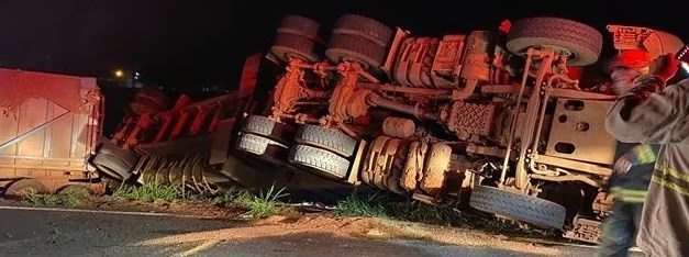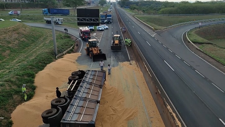 A história que se repete desde a duplicação da Euclides da Cunha: mais um acidente com tombamento de carreta ao deixar a alça de acesso do Trevo de Água Vermelha para ingressar na Rodovia Euclides da Cunha no sentido Rio Preto.