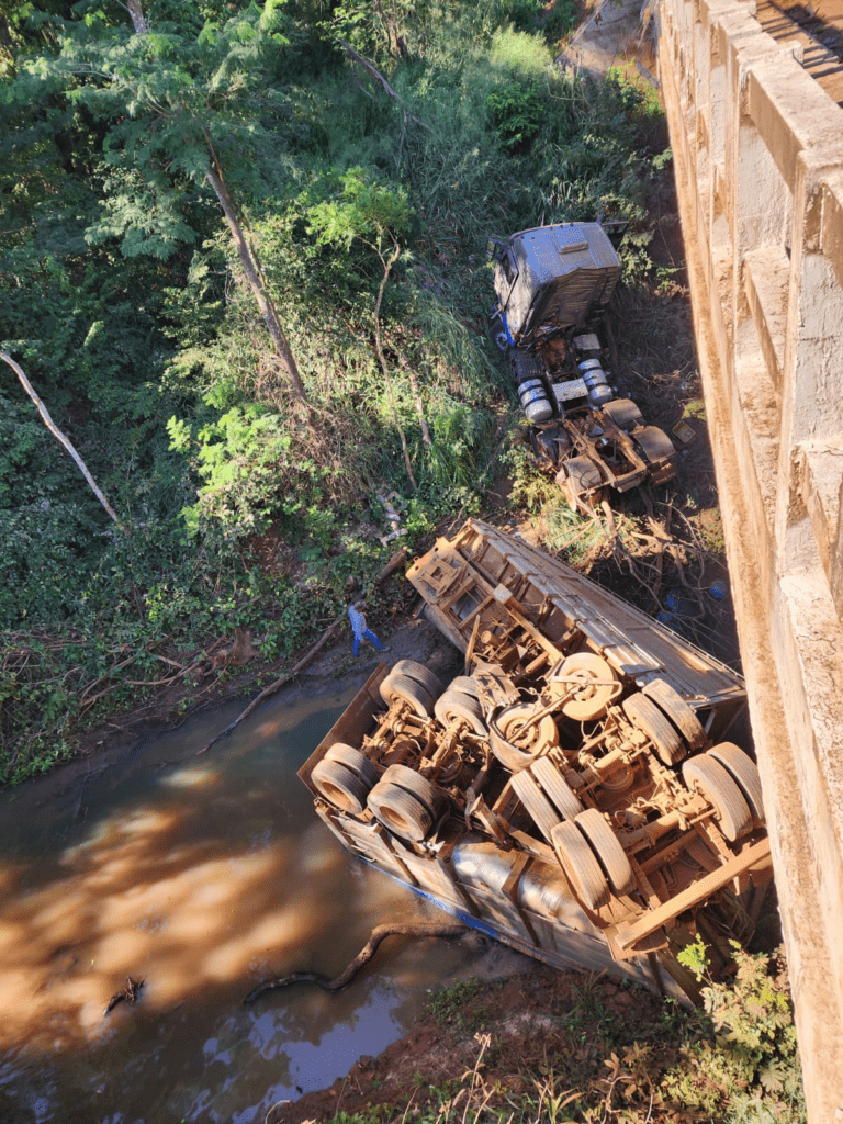 A colisão fez com que carreta despencasse da ponte o rio Três Barras próximo a uma pedreira.