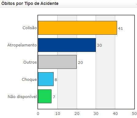 Em segundo lugar aparece atropelamento de pedestres com 27 mortes. Acidentes com automóveis resultaram em 24 mortes. Caminhões 3 e ônibus 1. Outros acidentes, 3.