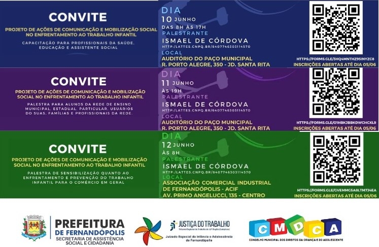 No encerramento das ações, dia 12, a palestra terá como tema a ‘sensibilização quanto ao enfrentamento e prevenção do trabalho infantil para o comércio em geral’. O evento terá início às 8h na sede da ACIF- Associação Comercial e Industrial de Fernandópolis, tendo como público-alvo os comerciantes e a comunidade em geral. Ao final haverá a distribuição de material impresso para que cada comerciante possa expor no seu comércio para a população ter acesso. Todas as palestras serão ministradas por Ismael de Córdova.