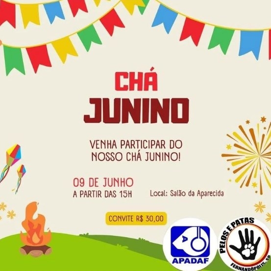 A Associação Pelos e Patas e a Apadaf– Associação dos Pais e Amigos dos Deficientes Auditivos - de Fernandópolis realizam no domingo, 9, mais uma edição do tradicional “Chá Junino”. Será a partir das 15 horas no Salão de Eventos do Centro Pastoral da Aparecida. Os convites estão à venda por R$ 30.