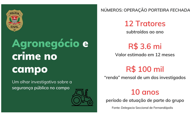 Segundo consta, o grupo surgiu entre os anos de 2021 e 2022 com a finalidade de cometer crimes contra a ordem tributária e furto de tratores que impactaram diretamente o setor do agronegócio paulista. Parte do grupo atua com este tipo de crime há mais de 10 anos.
