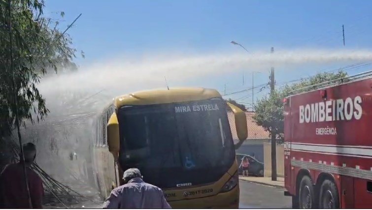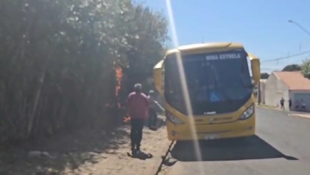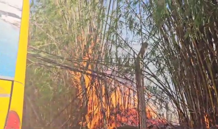 Os ônibus estavam estacionados ao lado do bambuzal que pegou fogo. Bombeiros precisaram intervir para conter as chamas