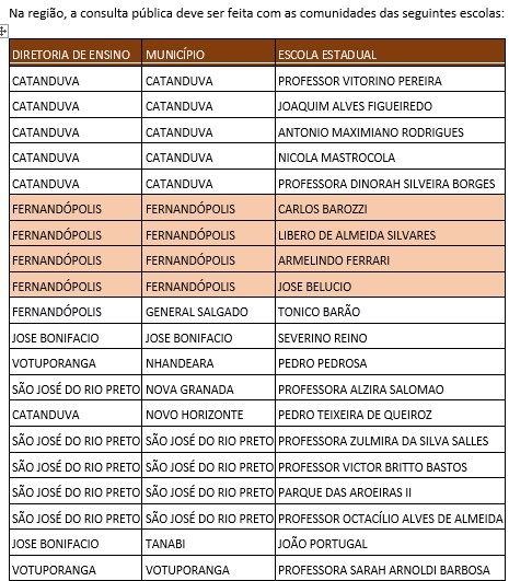 Quatro escolas de Fernandópolis manifestaram interesse na adesão ao novo modelo. São elas: EELAS, Armelindo Ferrari, Carlos Barozi e José Belúcio. Ainda na área da Diretoria de Ensino de Fernandópolis a Escola Tonico Barão de General Salgado também vai abrir o processo de consulta popular. Na região noroeste, 20 unidades escolares estão na lista de adesão ao modelo cívico-militar.