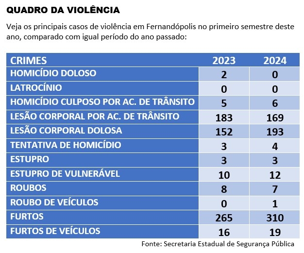 Nos crimes contra a vida, Fernandópolis fechou o primeiro semestre com zero homicídio doloso. No mesmo período do ano passado foram dois registros.