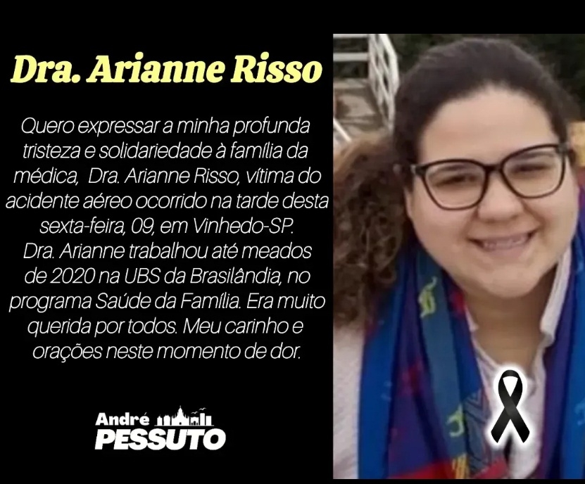 Em Fernandópolis, o prefeito André Pessuto também se manifestou sobre a morte da médica Arianne Risso. "Quero expressar a minha profunda tristeza e solidariedade à família da médica, Dra. Arianne Risso, vítima do acidente aéreo ocorrido na tarde destas sexta-feira, 09, em Vinhedo-SP. Dra. Arianne trabalhou até meados de 2020 na UBS da Brasilândia, no programa Saúde da Família. Era muito querida por todos. Meu carinho e orações neste momento de dor", escreveu o prefeito.
