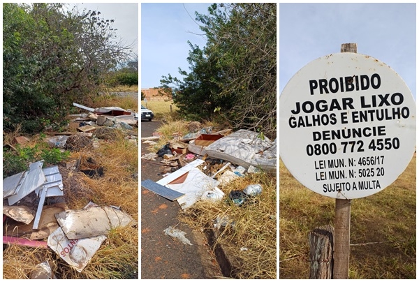 Na área, foram detectados descartes de materiais de construção, restos de móveis, apesar de placa indicar ser proibido descarte de entulho na área.