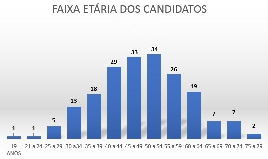 O candidato mais jovem da eleição é Bruno Silva Macedo do União Brasil. Ele é o único candidato com 19 anos. Na faixa seguinte, aparece a candidata Viviane Castro Lopes do PSD com 23 anos.