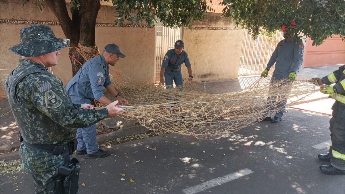 Com a ajuda de duas veterinárias do Zoológico de Rio Preto, a onça-parda foi sedada. Para evitar que o animal caísse da árvore e se machucasse, os bombeiros esticaram uma rede ao redor da copa para amortecer a queda do felino.