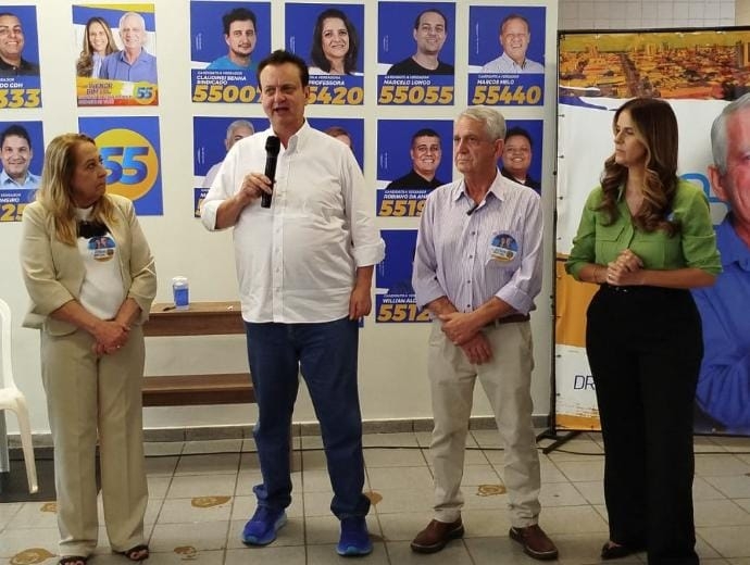 Kassab discursa durante evento político em Fernandópolis, ladeado pela ex-prefeita Ana Bim, o candidato a prefeito do PSD Avenor Bim e a vice Flávia Resende do PRD