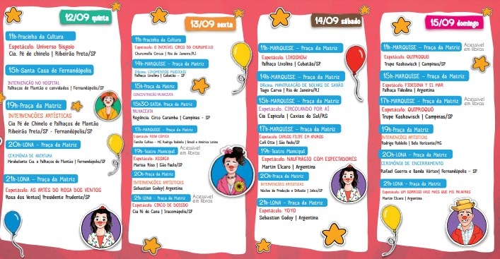 O evento vai reunir cerca de 40 artistas nacionais e internacionais, com uma programação diversificada que inclui apresentações circenses e teatrais, oficinas, debates, intervenções artísticas, e a tradicional palhaceata.