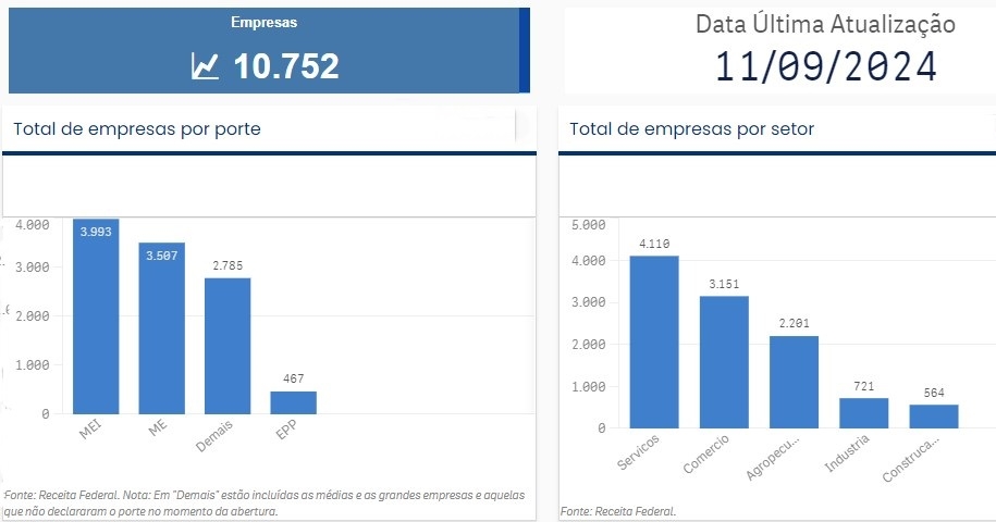 Ao todo estão cadastradas 10.752 empresas, de acordo com a última atualização realizada em agosto desse ano. Sendo que 3.993 deles são do MEI, outros 3.507 Microempreendedores (ME), 2.785 são voltadas para as médias e grandes empresas e aquelas que não declararam o porte no momento da abertura. Além das Empresas de Pequeno Porte (EPPs) que são 468 cadastradas, de acordo com o DataSebrae.