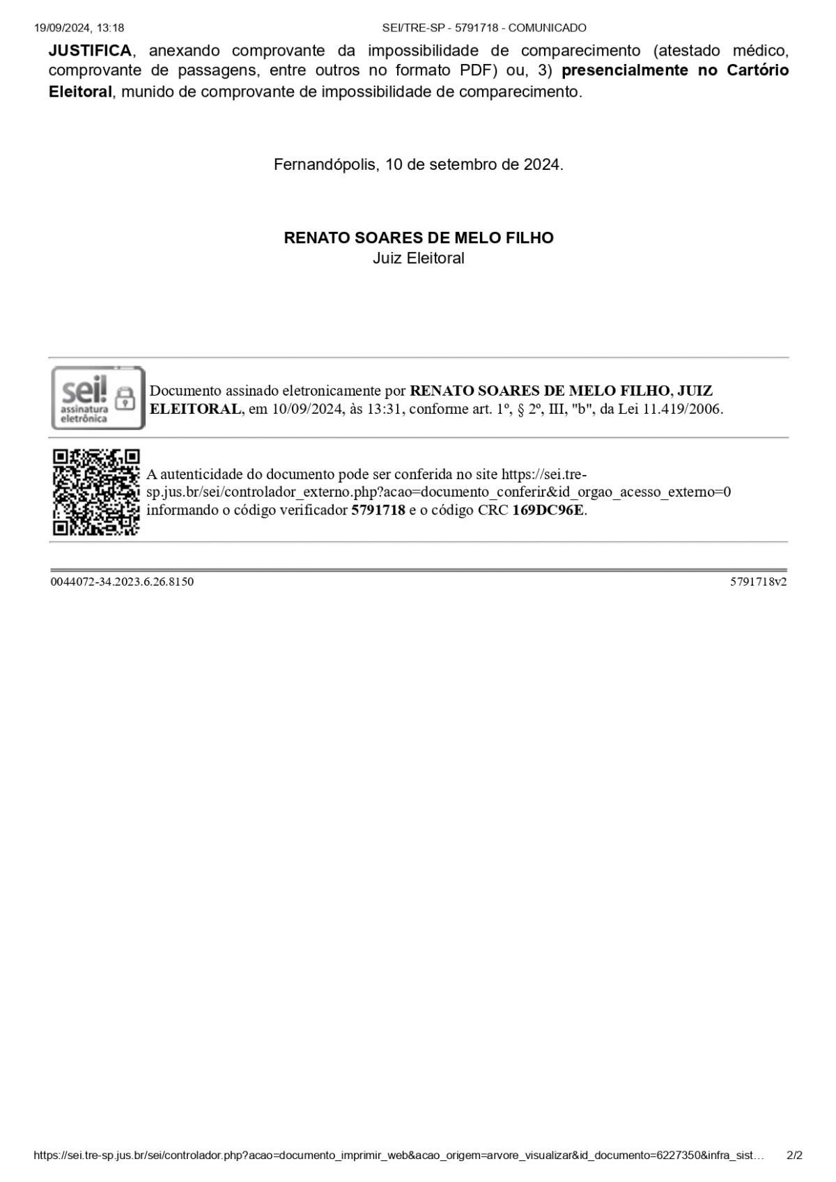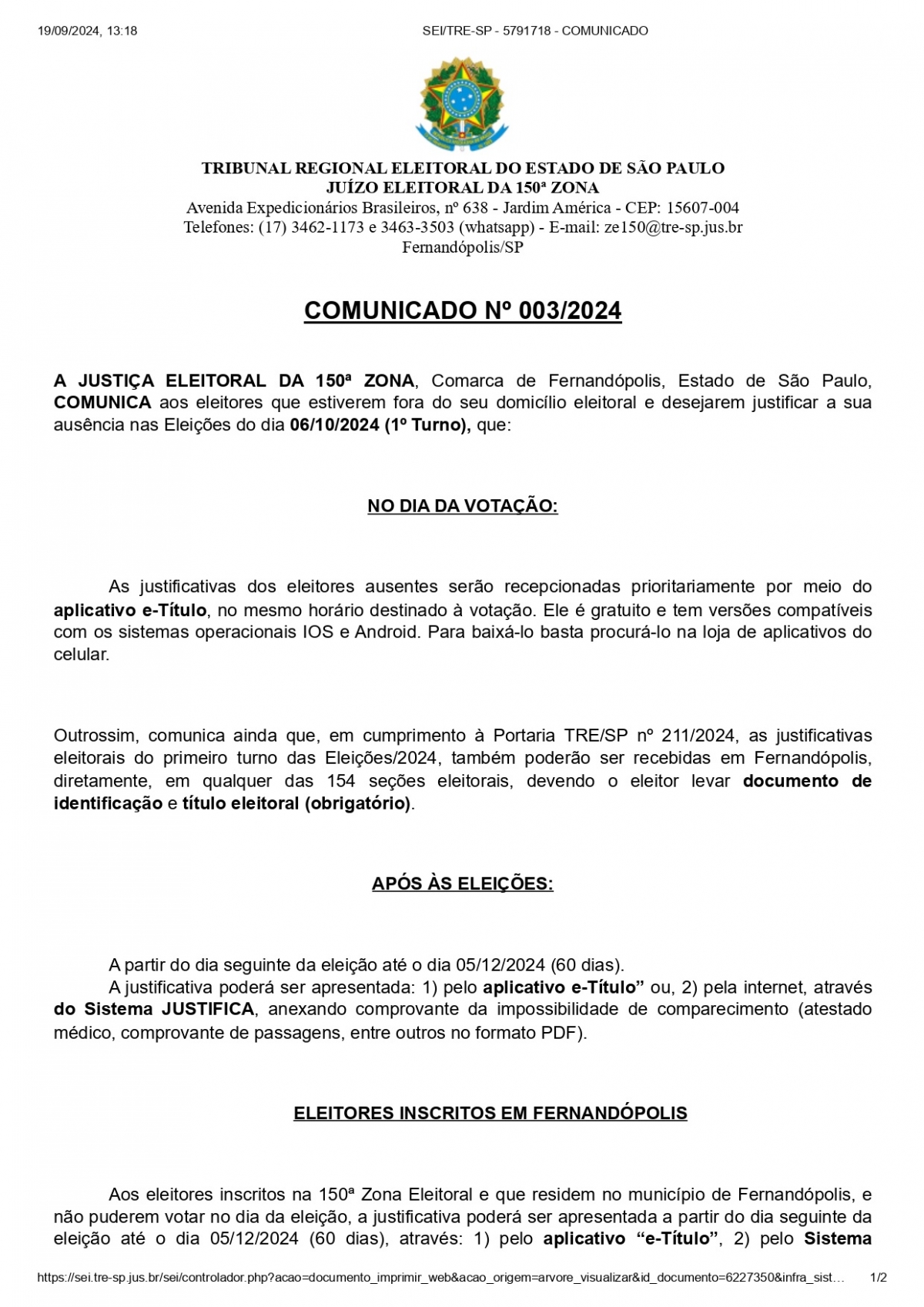 A Juiz da 150ª Zona Eleitoral de Fernandópolis, Renato Soares de Melo Filho, divulgou através de comunicado, orientações aos eleitores que estiverem fora do domicílio eleitoral e desejarem justificar ausência nas eleições de 6 de outubro. Leia abaixo: