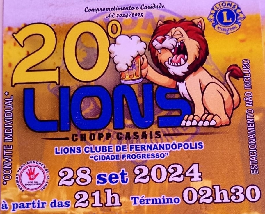 O tradicional “Lions Chopp Casais” organizado pelo Lions Clube Fernandópolis Cidade Progresso, a 20ª edição acontecerá no sábado, 18, a partir das 21 horas no The Villa Music. A noite com open food e open bar terá animação da Banda Estrela Super Som.