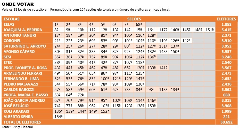 Neste domingo, 6, 50.642 eleitores vão às urnas em Fernandópolis para eleger prefeito e vereadores. A votação inicia às 8 horas e termina às 17 horas. São 18 locais de votação em Fernandópolis onde funcionarão 154 seções de votação. A Escola Joaquim Antonio Pereira é o maior colégio eleitoral da cidade, com 14 seções onde votam 5.415 eleitores. O menor colégio eleitoral é na Escola Municipal Alberto Senra no Jardim Ipanema, novo local de votação. Nesta eleição funcionará apenas uma sessão na escola, com 221 eleitores.
