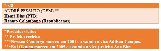 Outro detalhe histórico: desde 2000, quando foi instituída a reeleição, apenas um prefeito conseguiu obter nas urnas o segundo mandato seguido. O tabu foi quebrado por André Pessuto em 2020. Antes disso, disputaram e perderam a reeleição: Armando Farinazo, Luiz Vilar e Ana Bim.