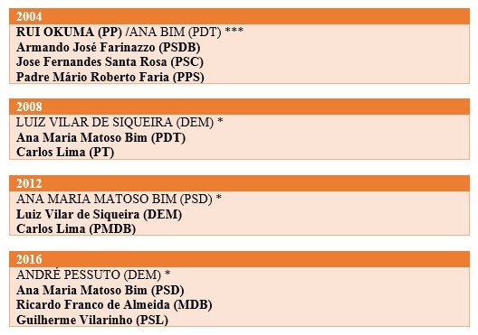 Neste período de 73 anos, em 18 períodos de governo, apenas cinco prefeitos comandaram a cidade por duas vezes. Quatro deles, em mandatos alternados: Edison Rolim, Milton Leão, Newton Camargo Freitas e Luiz Vilar. Ana Bim chegou a comandar a cidade em dois períodos, mas, em um deles, assumiu a prefeitura para completar o mandato de Rui Okuma que morreu em 2005.