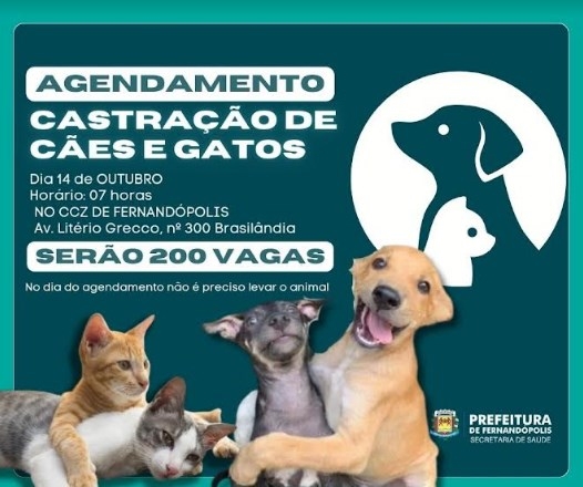 A quarta etapa vai distribuir 200 vagas entre cães e gatos para procedimentos a serem realizados nos próximos meses. As senhas serão distribuídas no próximo dia 14 de outubro, segunda feira, às 7 horas da manhã.