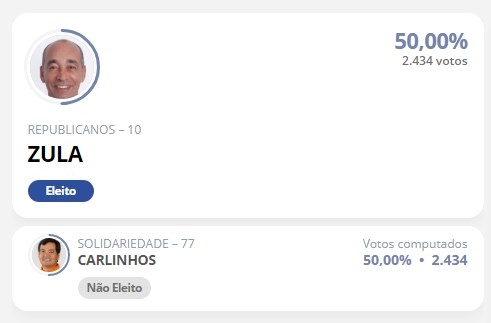 Carlinhos (Solidariedade) disputou a prefeitura com Zula (Republicanos). Nas urnas, ambos receberam a mesma quantidade de votos: 2.434. Foram registrados 92 votos nulos, 71 brancos e 749 abstenções na cidade.