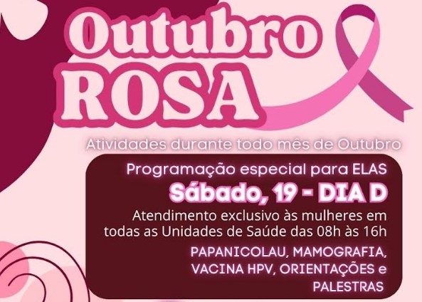 Dentro da programação da campanha será realizado o “Dia D” da campanha, com as Unidades Básicas de Saúde dos bairros abrindo o dia todo para atendimento exclusivo às mulheres. Será no sábado, 19 de outubro, das 08h às 16h, quando elas terão oportunidade de realizar exames, receber orientações sobre doenças e métodos de prevenção.