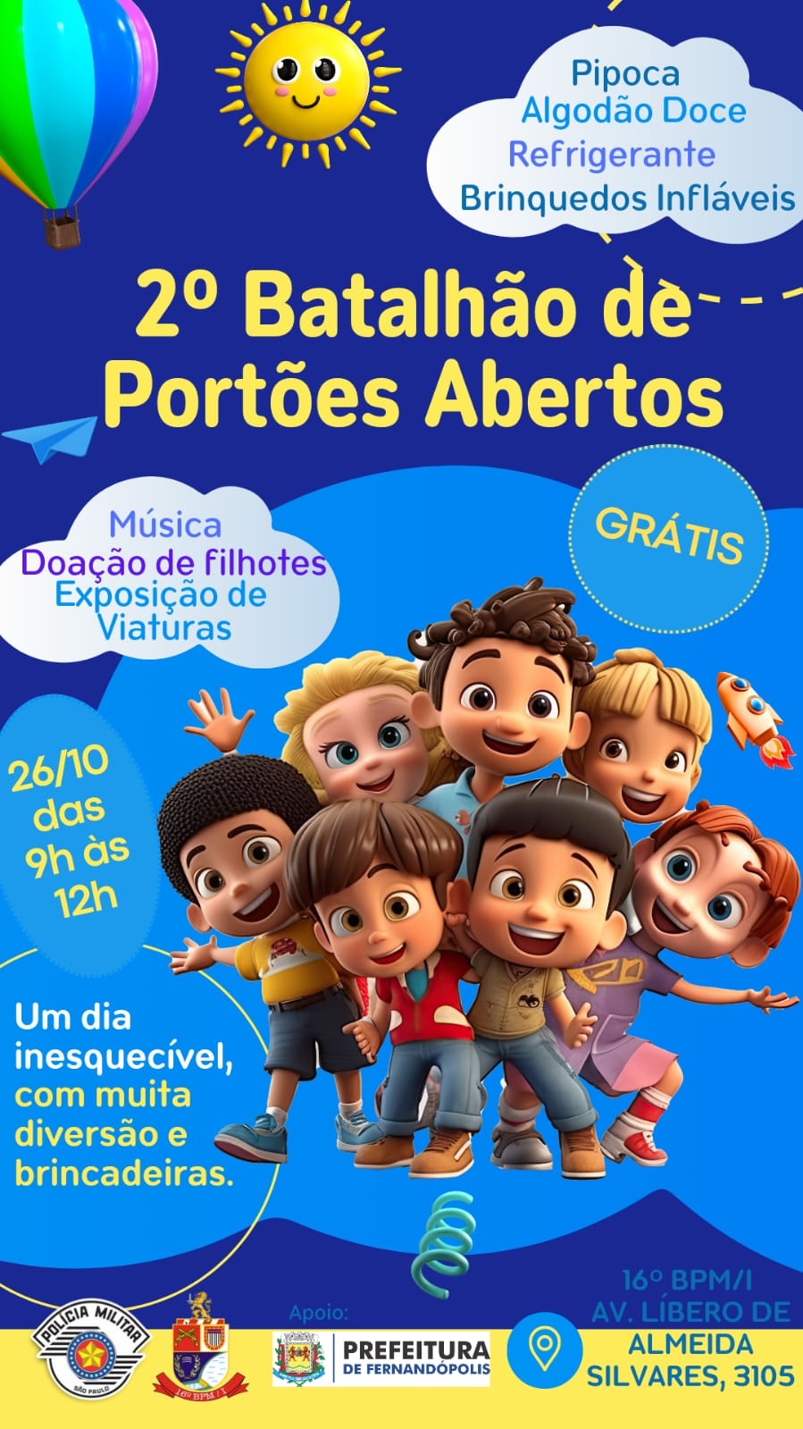 A primeira edição do “Batalhão de Portões Abertos” no ano passado foi um sucesso. O comandante do 16º BPMI, Tenente Coronel Ivan Belentani diz que este ano não será diferente. "As crianças serão recebidas com muitas atrações desde guloseimas (algodão doce, pipoca, refrigerante), brinquedos infláveis, música com a participação da Orquestra de Sopros de Fernandópolis, Banda Regimental do CPAI-5 e Serginho Kamiyama, doação de animais, exposição de viaturas (Polícia Militar, Corpo de Bombeiros, Policia Ambiental e Polícia Rodoviária), tenda para atendimento de crianças com TEA - Trasntrono do Espectro Austista e muitas outras atrações. Será um dia inesquecível”, diz.
