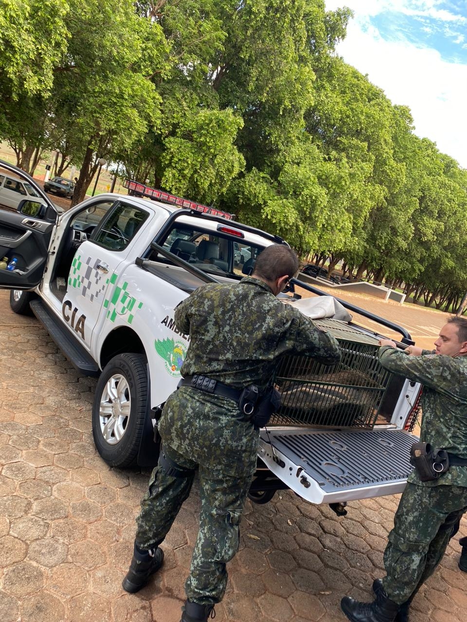 Momento que os policiais ambientais chegam com o animal ferido