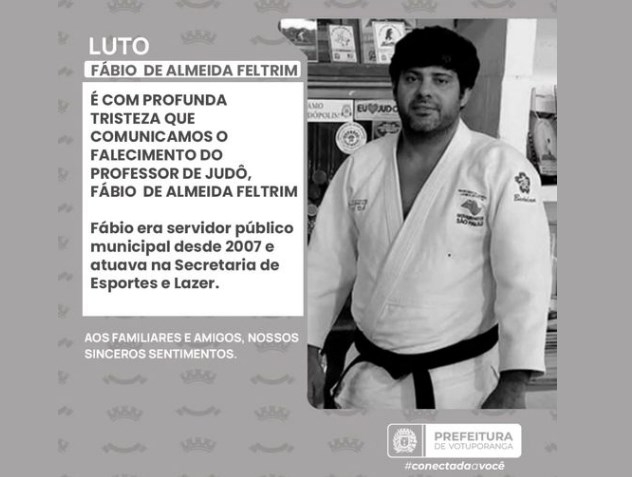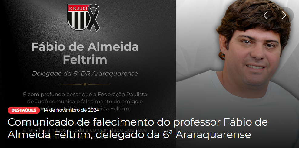 “É com profundo pesar que a Federação Paulista de Judô comunica o falecimento do professor Fábio de Almeida Feltrim, delegado da 6ª Delegacia Regional Araraquarense. Professor Fábio dedicou sua vida ao judô, contribuindo de maneira exemplar para o desenvolvimento técnico e humano de atletas e professores da região.