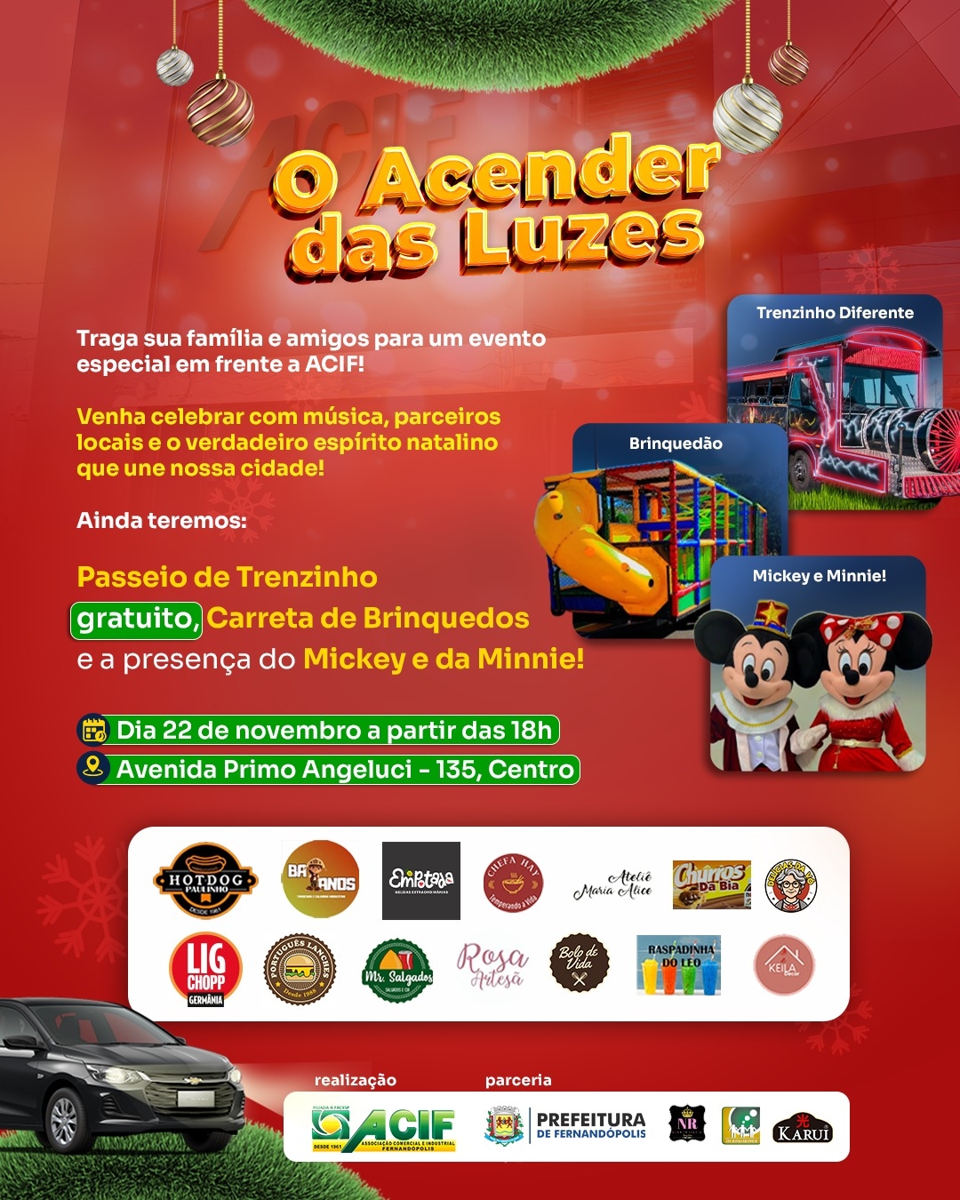 A Acif – Associação Comercial e Industrial de Fernandópolis – abrirá as celebrações natalinas com a 1ª edição do "Acender das Luzes" na noite desta sexta-feira, 22, a partir das 18 horas. O evento integra a campanha “Natal de Sonhos” que vai distribuir mais de R$ 100 mil em prêmios, incluindo o sorteio de um carro zero quilômetro.