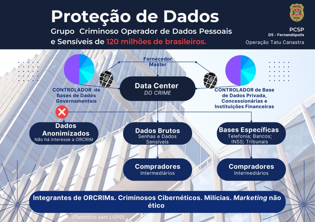 O grupo investigado conta atualmente com sete pessoas. Investigações revelaram que dados da maior parte dos brasileiros pode estar nas mãos de criminosos, o que afronta a LGPD – Lei Geral de Proteção de Dados - e traz vulnerabilidades que facilitam a prática de crimes cibernéticos, o principal foco da operação.