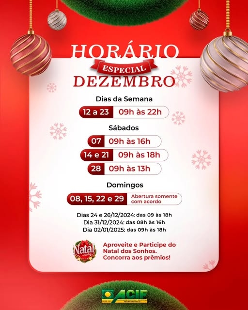 O comércio, que lançou a promoção "Natal dos Sonhos" com sorteio de um carro zero km, inicia período de abertura das lojas até às 22 horas. De acordo com a Acif, o comércio ficará aberto das 9 às 22 horas durante a semana e até às 18 horas nos sábados que antecedem o Natal.