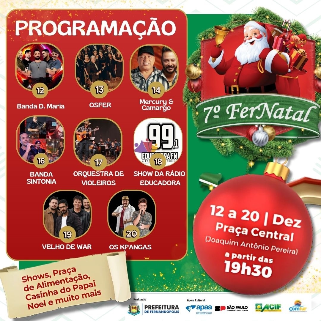 O Fernatal começa nesta quinta-feira, 12, com a chegada oficial do Papai Noel, acompanhado pela Mamãe Noel. Após desfile pela cidade, o casal Noel atenderá as crianças na Casinha montada na Praça Joaquim Antonio Pereira, a partir das 19h30. Papai e Mamãe Noel estarão atendendo as crianças até o próximo dia 20 de dezembro, das 19h30 às 22h30.