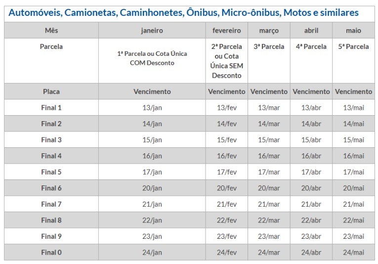 Os contribuintes podem pagar o imposto em janeiro, em cota única, com desconto de 3%; pagar integralmente em fevereiro, sem desconto; ou parcelar o tributo em até cinco vezes (janeiro, fevereiro, março, abril e maio), de acordo com o final da placa do veículo (veja calendário abaixo).