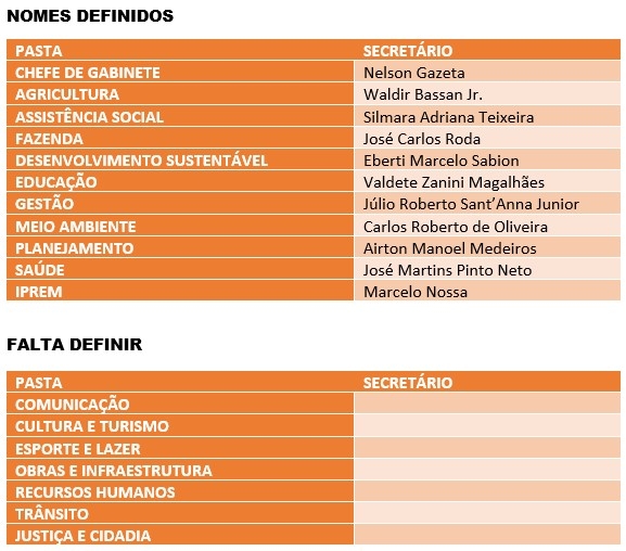 O prefeito ainda precisa confirmar os nomes dos secretários de Comunicação, Cultura e Turismo, Esportes e Lazer, Obras e Infraestrutura, Recursos Humanos, Trânsito e Justiça e Cidadania.