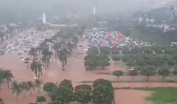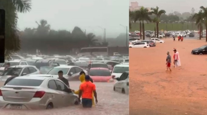Estacionamento do principal parque turístico da cidade, o Thermas dos Laranjais, ficou alagado com carros submersos