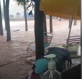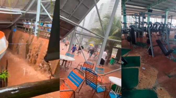 As imagens mostram a água avançando sobre cadeiras e mesas utilizadas pelos visitantes do parque.