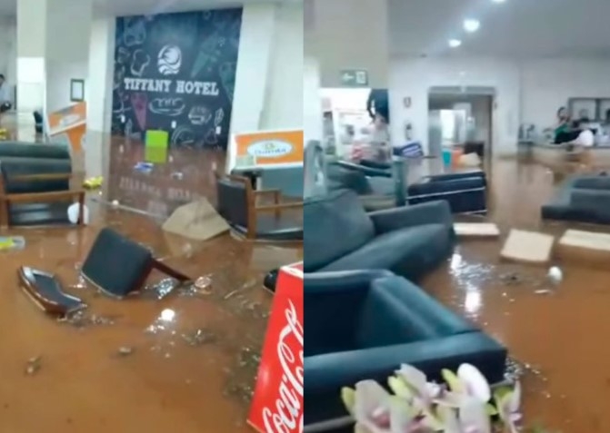 Enxurrada invadiu hotel na principal avenida de Olimpia. Fotos: Diário de Olímpia e redes sociais