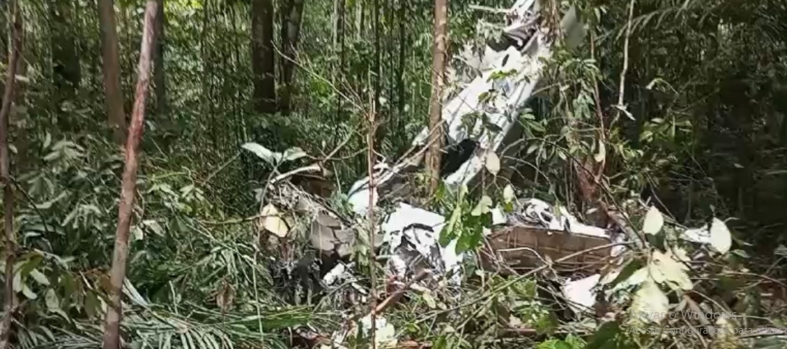 A aeronave não explodiu na queda e destroços se espalharam em meio a floresta