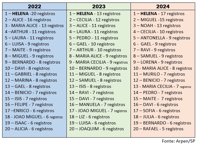 O ranking dos nomes mais populares de 2024 ainda coloca Miguel em segundo lugar, , seguido de Noah (veja abaixo o ranking dos 20 nomes preferidos em Fernandópolis).