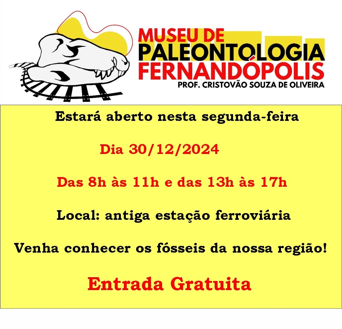 O Museu de Paleontologia de Fernandópolis, também conhecido como “Museu do Dinossauro” está aberto nesta segunda-feira, 30, para visitas. De acordo com a programação, a abertura será das 8 às 11 horas e das 13 às 17 horas. A entrada é gratuita. Museu de Paleontologia Prof. Cristóvão Souza de Oliveira foi inaugurado no último dia 19 e funciona na antiga estação ferroviária.